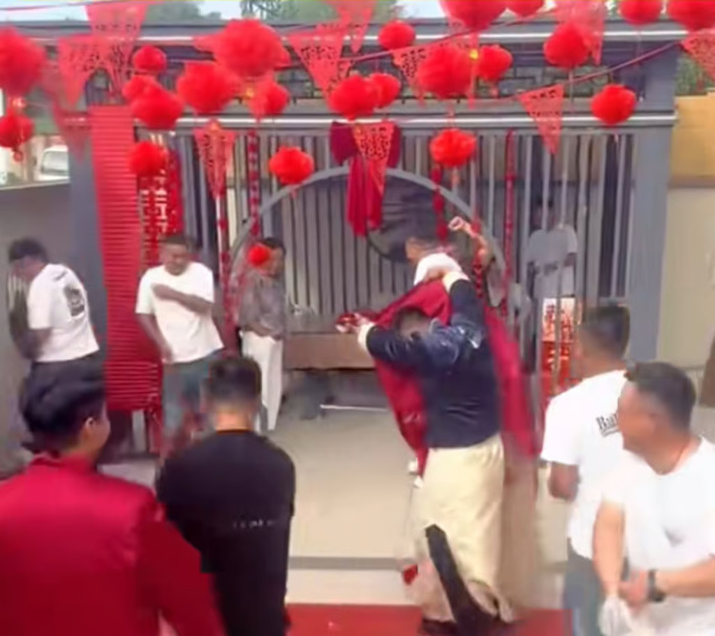 Menurut laporan itu, sebuah video tular menunjukkan para pengapit pengantin diikat pada sebuah skuter elektrik dan dipaksa mencium orang asing.